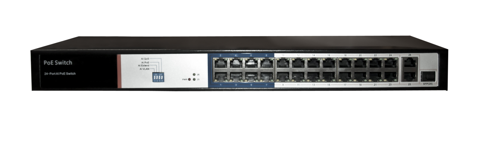 SPE10224E jest wyspecjalizowanym, niezarządzalnym switchem do zastosowań wewnętrznych, zaprojektowanym do obsługi systemu monitoringu oraz innych systemów sieciowych. Zapewnia 24 porty PoE o przepustowości 10/100 Mbps (do podpięcia kamer PoE), 1 port combo (uplink oraz światłowodowy) o przepustowości 1Gbps oraz 1 port uplink o przepustowości 1Gbps/100Mbps (do podłączenia rejestratora, routera lub kolejnego switcha). Switch SPE10224E oferuje pięć trybów pracy: domyślny, VLAN, rozszerzony, AI PoE oraz QoS , których wybór następuje za pośrednictwem łatwo dostępnego przełącznika znajdującego się na panelu przednim.