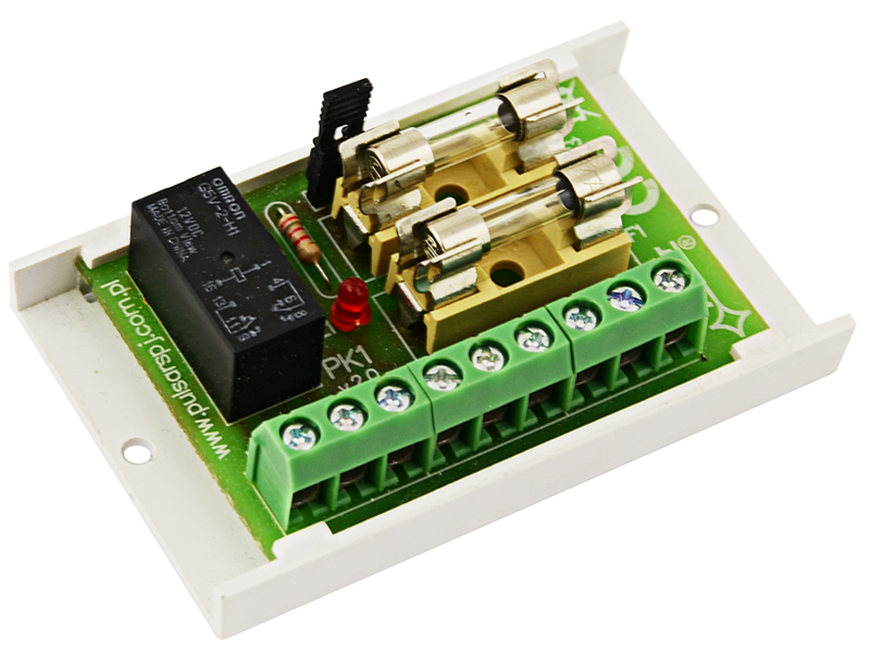 Moduł przekaźnikowy PK1 przeznaczony jest do stosowania w instalacjach niskonapięciowych. Służy do sterowania, sygnalizowania stanów np. w systemach alarmowych, kontroli dostępu. Może być stosowany do sterowania urządzeniami o dużym poborze prądu poprzez wyjścia OC systemów alarmowych. Ponadto zapewnia separację galwaniczną sygnałów, źródeł zasila. Posiada szeregowy bezpiecznik w obwodzie przekaźnika.