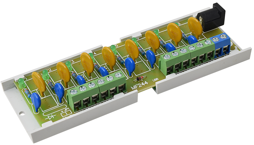Moduł bezpiecznikowy przeznaczony jest do rozdziału zasilania w systemach alarmowych niskonapięciowych wymagających napięcia z zakresu: 10V÷ 30V DC. Posiada dwa wejścia zasilania: złącze śrubowe i gniazdo DC 5,5/2,1 oraz cztery niezależnie zabezpieczone bezpiecznikami polimerowymi PTC 1A wyjścia zasilania AUX1÷AUX8. Zadziałanie bezpiecznika PTC sygnalizowane jest poprzez zgaszenie odpowiedniej diody LED modułu: L1 dla AUX1, L2 dla AUX2 itd. Dodatkowo każde z wyjść zabezpieczone jest warystorem chroniącym zasilacz oraz odbiorniki przed skutkami wystąpienia przepięć w układzie zasilania.