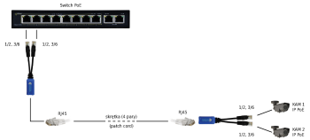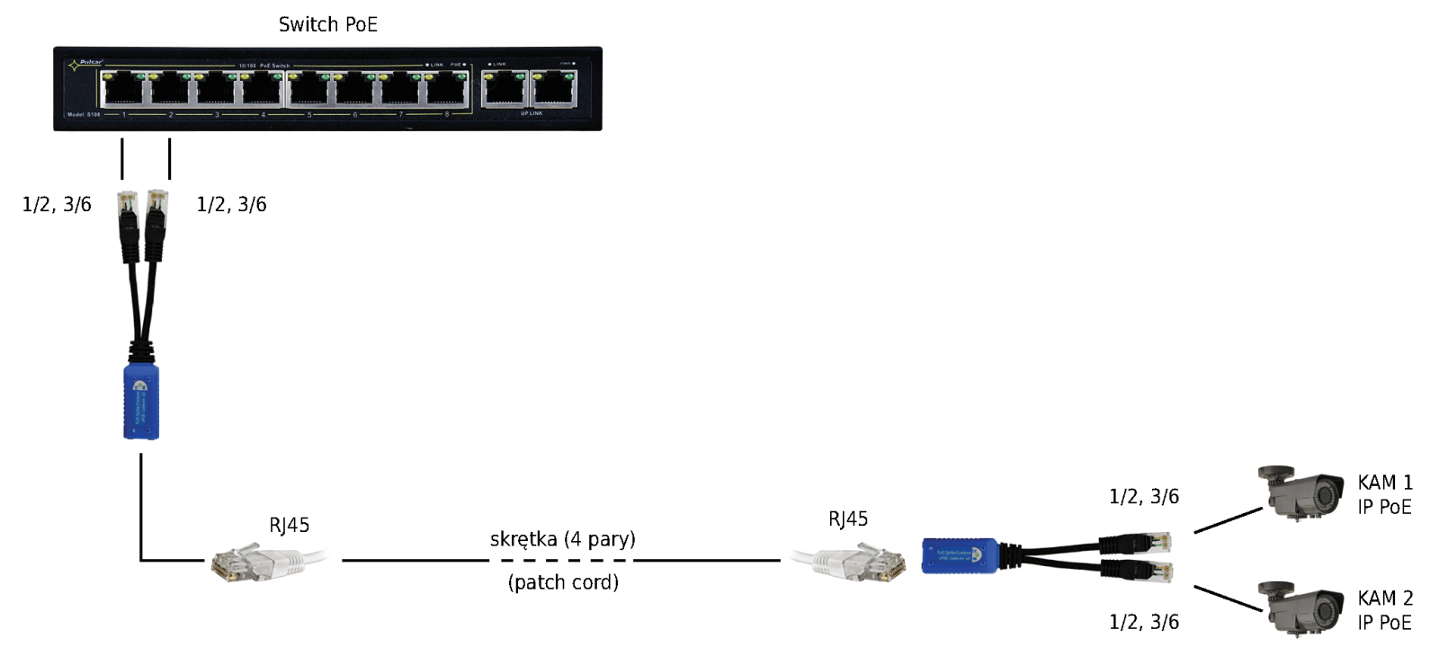 Splitter P-POE2 umożliwia przesłanie zasilania i danych do dwóch kamer IP PoE lub innych urządzeń zgodnych z tym standardem za pomocą skrętki UTP kat. 5e. Wykorzystuje 4 pary przewodów, gdzie dwie pary obsługują jedno urządzenie, natomiast pozostałe drugie. Wymaga to stosowania wyłącznie akcesoriów, które są zgodne ze standardem 802.3af/at mode A (endspan), przesyłają dane i zasilanie parami 1/2 i 3/6. Urządzenie przeznaczone jest do pracy w sieciach 10/100Mb/s.