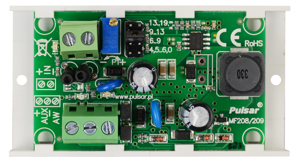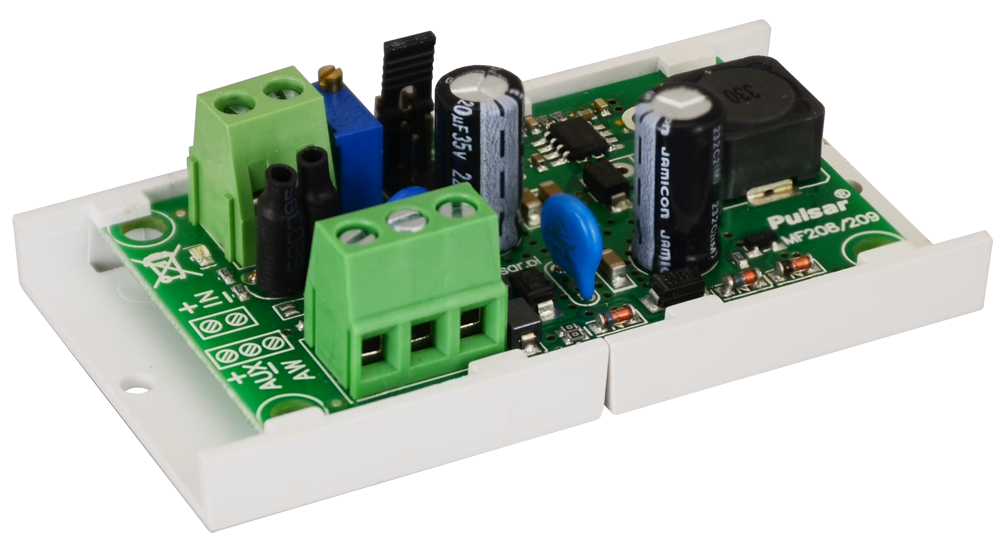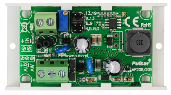 Moduł przetwornicy obniżającej napięcie DC/DC 1A (DC/DC10SD) służy do obniżenia napięcia z zakresu 8V÷28V DC na wejściu przetwornicy do napięcia z zakresu 4,5V÷19V DC na wyjściu, ustawionego potencjometrem P1. Maksymalny prąd obciążenia wynosi Imax=1A (Pmax=12W). Aby przetwornica pracowała poprawnie musi być zachowana różnica 3V między napięciem wejściowym (obniżanym), a wyjściowym. Moduł nie posiada izolacji galwanicznej pomiędzy wej/wyj (IN-AUX), pracuje na wspólnym potencjale „masy” (0V) (zaciski IN- oraz AUX- są połączone galwanicznie = zacisk wspólny).