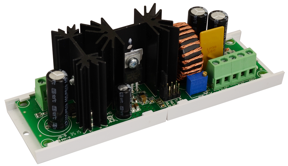 Moduł przetwornicy obniżającej napięcie DC/DC 5A (DC/DC50SD) służy do obniżenia napięcia z zakresu 8V÷28V DC na wejściu przetwornicy do napięcia z zakresu 4,5V÷24V DC na wyjściu, ustawionego potencjometrem VADJ. Maksymalny prąd obciążenia wynosi Imax=5A (Pmax= 60W). Aby przetwornica pracowała poprawnie musi być zachowana różnica 2V między napięciem wejściowym (obniżanym) a wyjściowym. Moduł nie posiada izolacji galwanicznej pomiędzy wej/wyj (IN-AUX), pracuje na wspólnym potencjale „masy” (0V) (zaciski IN- oraz AUX- są połączone galwanicznie = zacisk wspólny).