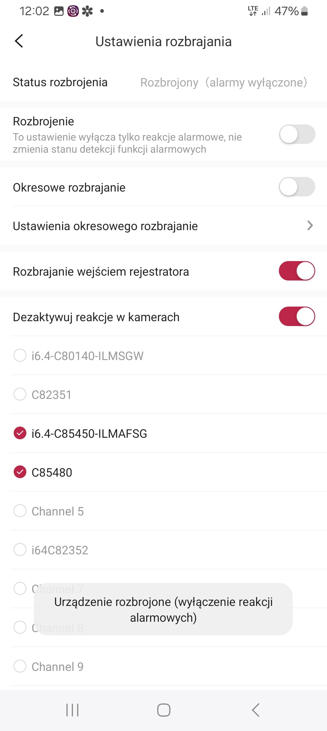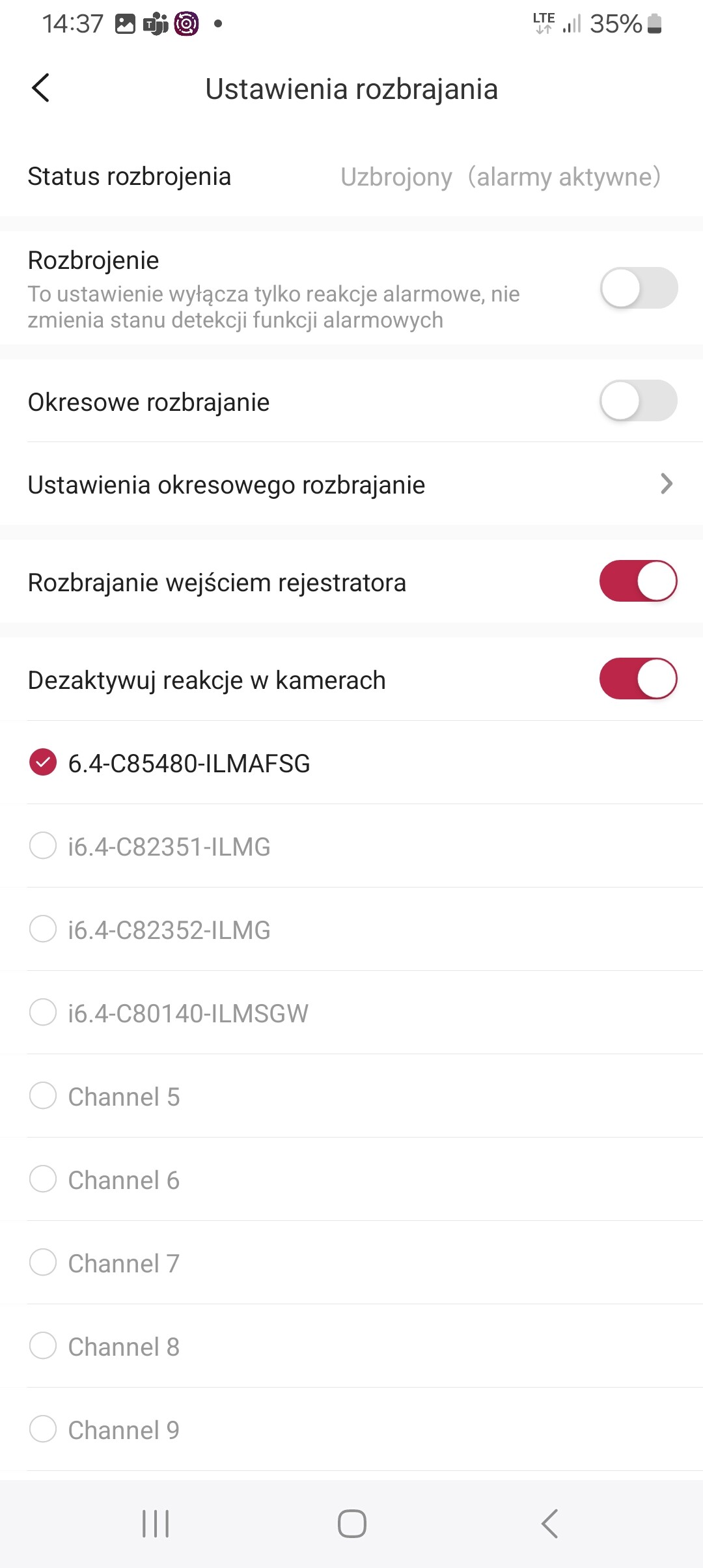 - (3) dodane menu: Rozbrojenie (wyłączenie reakcji alarmowych) oraz podmenu zawierające przełączniki: rozbrojenie, rozbrojenie według harmonogramu, ustawienie tygodniowego harmonogramu rozbrojenia oraz wybór kanałów (kamer), których reakcje będą podlegać rozbrojeniu. W menu rozbrojenia wyświetlany jest stan rejestratora : uzbrojony lub rozbrojony, co jest istotne, gdy sterowanie rozbrojeniem odbywa się z wejścia alarmowego rejestratora.