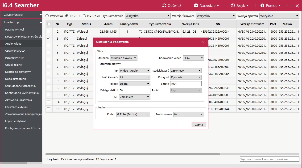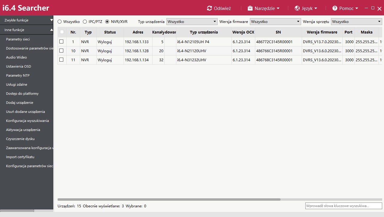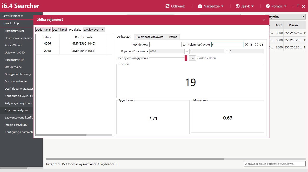 Wyszukiwanie urządzeń INTERNEC serii i6.4 włączonych w lokalną sieć LAN. Umożliwia zmianę adresu IP, ustawienia parametrów obrazu i kodowania, zmianę hasła, ustawienie czasu, aktualizację oprogramowania, eksport i import ustawień. Dodatkowo program zawiera kalkulator zajętości dysku.