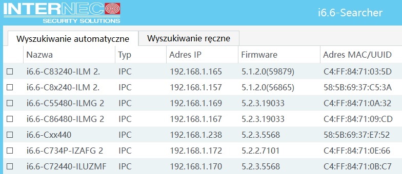 Wyszukiwanie urządzeń INTERNEC serii i6.6 włączonych w lokalną sieć LAN. Umożliwia zmianę adresu IP, ustawienia parametrów obrazu i kodowania, zmianę hasła, ustawienie czasu, aktualizację oprogramowania, eksport i import ustawień.